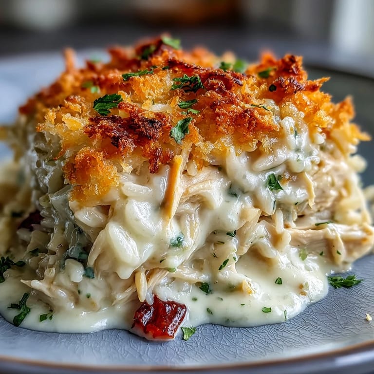 Save to Pinterest My kitchen smelled like butter and garlic one lazy Sunday afternoon when I decided to stop overthinking dinner and just throw together what felt right. I had leftover shredded chicken, a box of rice, and two cans of soup staring at me from the pantry, so I thought, why not make something creamy and forgiving? What emerged from that oven forty minutes later was this golden, bubbling casserole that tasted like someone had taken all the comfort of a home-cooked meal and trapped it under a crispy breadcrumb blanket. My neighbor's nose appeared over the fence before the first plate even hit the table.