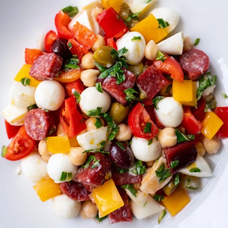 Sometimes I swap the chickpeas for white beans or add marinated artichokes if I want to stretch the servings. The recipe is incredibly forgiving and welcomes whatever sounds good from the antipasto bar at your grocery store.
