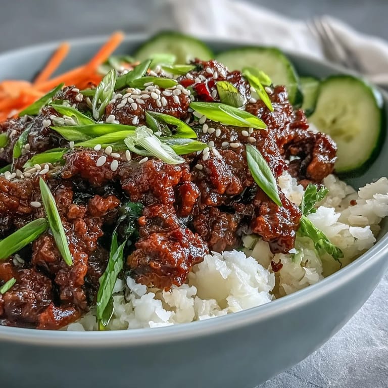 - Spoon the beef and all its sauce over the rice, then layer your cucumber, carrot, and green onions like you're building something beautiful. Finish with sesame seeds and optional chili or kimchi if you want extra personality.
