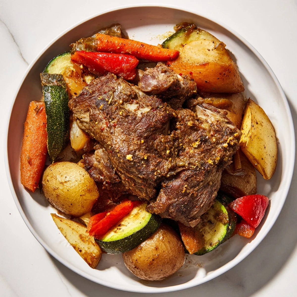 Root vegetables like potatoes and carrots, along with zucchinis and bell peppers, add texture and sweetness balancing the savory meat.