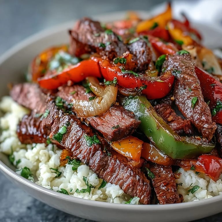 - Start with a bed of cauliflower rice then pile on those gorgeous peppers and steak strips generously.